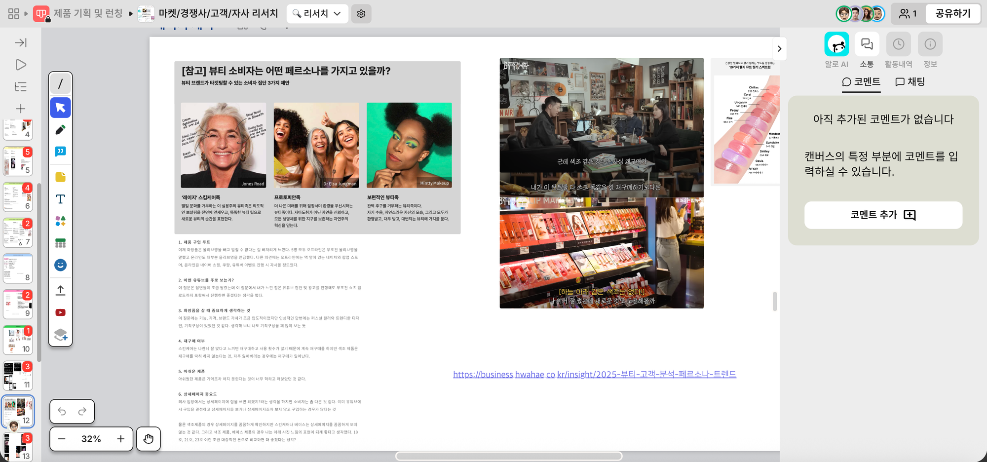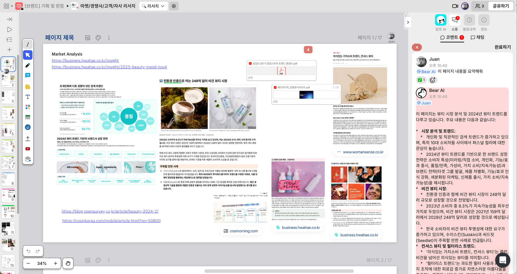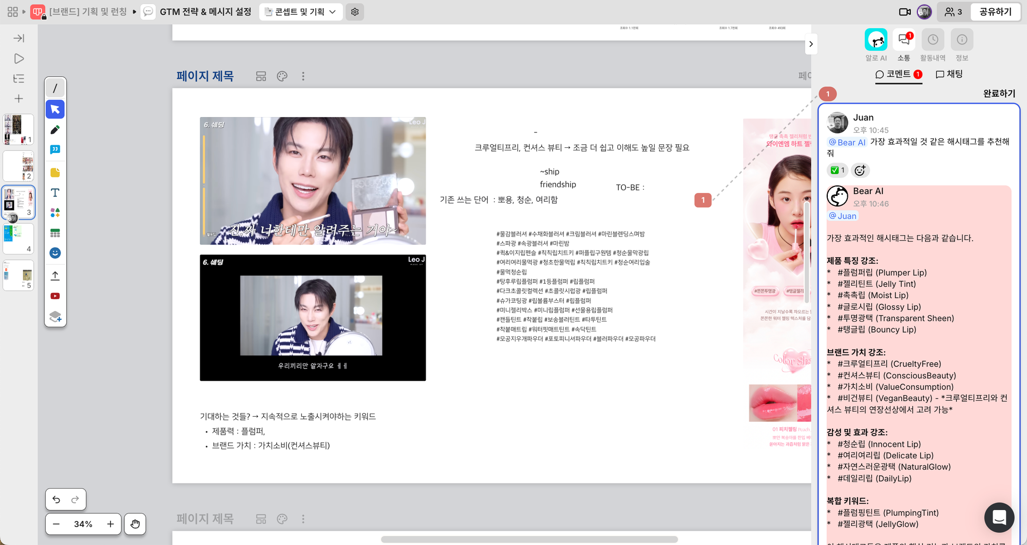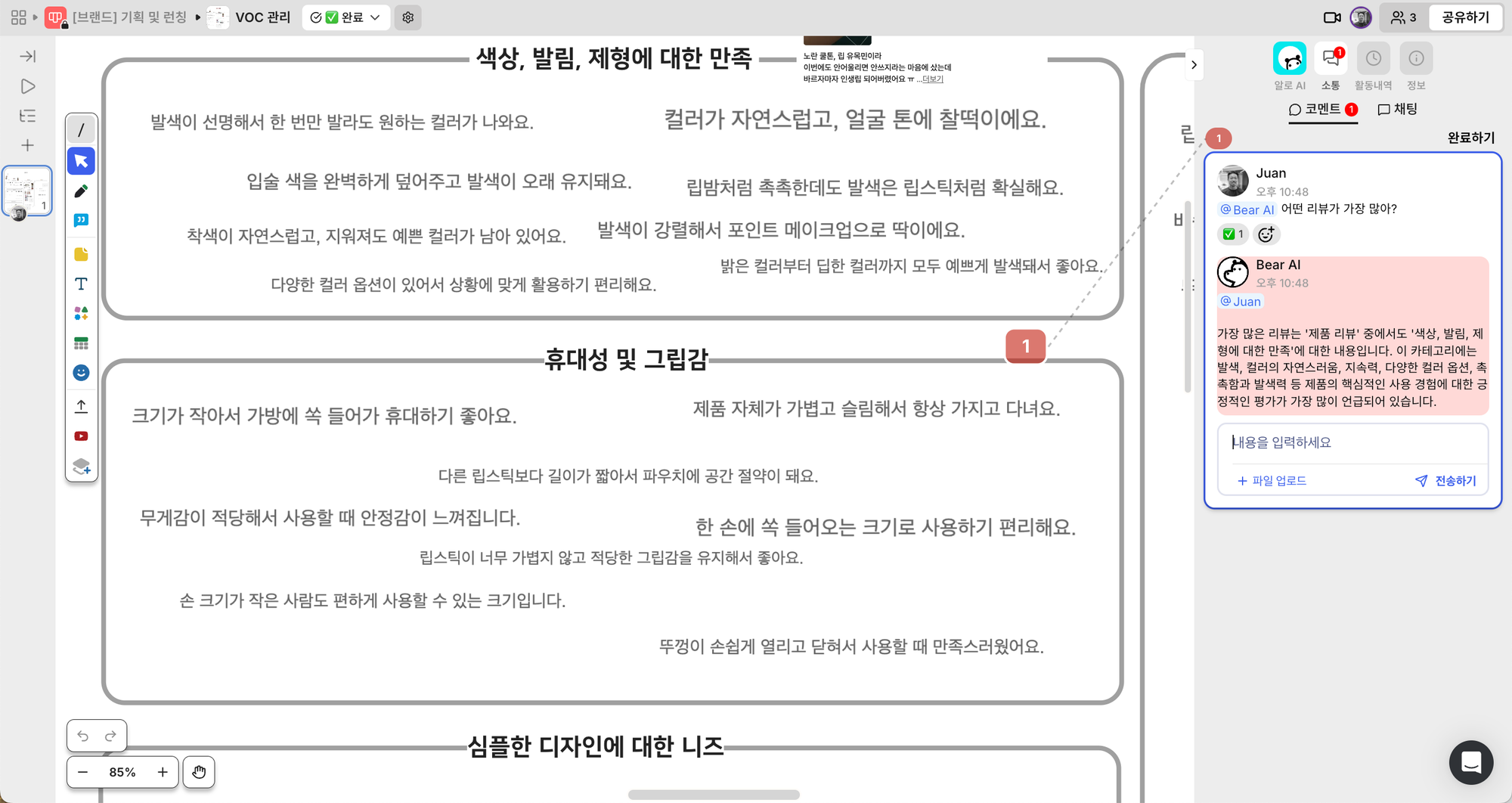 예를 들면, ALLO의 Canvas AI는 브레인스토밍 단계부터 디자이너의 협업 파트너로 활약합니다. 아이디어를 빠르게 구조화하고 다음 스텝을 제안하여 기획 단계의 효율을 높여주죠. 그리고 디자인 시안 단계에서 ALLO는 음성 메모 피드백, 화면 주석, 버전 관리 등을 지원해 모든 피드백이 시각적 맥락과 함께 한 곳에 기록됩니다. 마케터는 슬랙 메시지나 이메일을 보내지 않고도 ALLO 보드 위에 직접 “여기 문구를 좀 더 눈에 띄게 변경 바랍니다”라고 코멘트를 남길 수 있고, 개발자는 “이 부분 로딩 속도 우려됨”이라는 이슈를 코멘트를 이용해 디자이너와 같은 보드에 표시할 수 있습니다. 모든 직군의 피드백이 한 화면에 통합되니 디자이너는 툴을 전환하지 않고도 종합적인 수정 방향을 파악할 수 있습니다.