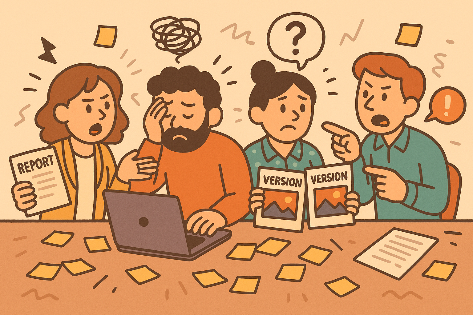 - 메신저·구두 위주의 소통에 따른 혼선: 앞서 언급했듯, 메신저 대화나 구두 전달만으로 협업이 진행되면 논의된 내용이 금방 휘발되어 문제가 발생합니다. 카카오톡이나 이메일로 주고받은 논의 내용을 따로 정리하지 않고 담당자들의 머릿속에만 남아 있어, 시간이 지나면 누가 어떤 말을 했는지 잊어버리기 일쑤입니다. 심지어 메신저로는 파일 공유에도 한계가 있어 나중에 찾기 어렵고, 회의 때 나온 피드백은 따로 정리하지 않으면 사라집니다. 그 결과 매번 같은 내용을 물어보거나 지난번에 결정된 내용도 다시 논의하는 문제가 발생합니다. 구두 전달 또한 당사자 외에는 알 수 없어 잘못된 방향으로 진행돼도 금방 알아차릴 수 없습니다. 이러한 소통 방식은 협업의 투명성이 부족해지고, 새로 투입된 인원이 과거 히스토리를 파악하기 어렵게 만들며, 팀워크보다는 개인 의존도를 높입니다.