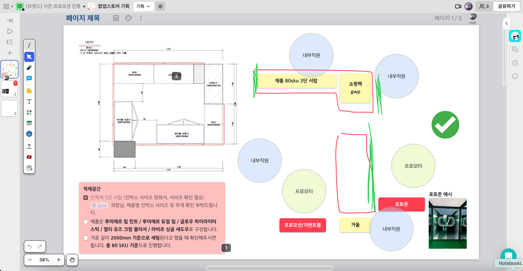 이러한 문제들을 해결하려면 기획 단계부터 한 공간에서 협업할 수 있는 새로운 접근이 필요합니다. 이상적인 구조는 마케팅, MD, 디자인 모든 실무자가 단일 협업 플랫폼에 모여 기획전 콘셉트, 콘텐츠 방향성, 상품 구성 정보를 공유하고 실시간으로 피드백을 주고받는 것입니다. 즉, 기획자들은 초안 아이디어를 올리고, MD는 추천 상품 리스트와 재고 정보를 붙이며, 디자이너는 시각화된 목업을 같은 화면에서 제시해 함께 보면서 의견을 나누는 형태를 생각해 볼 수 있습니다. 모든 피드백과 결정이 한 곳에 기록되므로 누가 언제 무엇을 제안했고 변경했는지 히스토리가 남아 투명한 협업이 이뤄집니다. 메신저로 전달하다 회의실로 가서 다시 설명하는 게 아니라, 온라인 화이트보드 안에서 댓글을 남기고 업데이트하니 업무 진행속도가 빨라집니다. 실제 연구에서도 협업 기술의 발전으로 이메일 등 기존 시스템에 의존하던 방식을 넘어서 자료 공유와 피드백을 한곳에 모으는 것이 최근 높은 성과를 내는 팀의 특징으로 지목됩니다. 이런 환경에서는 자료가 흩어지지 않고 검색 가능한 기록으로 남기에, 중간에 새로운 팀원이 합류해도 플랫폼 내에서 검색을 통해 금세 파악할 수 있고, 이해도를 높여 실수를 예방할 수 있습니다.