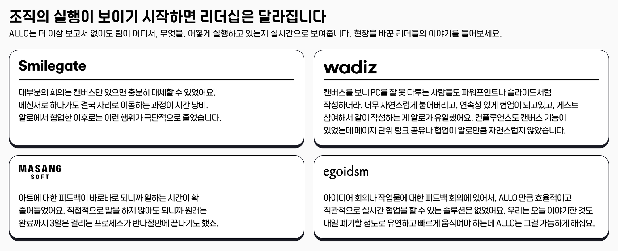 무엇보다 ALLO의 강점은 기존 도구들의 분절된 기능을 통합하여 원페이지 협업 환경을 제공한다는 점입니다. 과거에는 기획전 하나 진행하려고 Slack으로 대화하고, Google Docs로 아이디어 정리하고, Excel로 상품 리스트 관리하고, Zoom으로 회의하고, 디자인 시안은 이메일로 보내는 등 툴을 전전하며 공유 받은 정보를 따라잡기 바빴습니다. ALLO에서는 이러한 기능이 한데 묶여 있으므로 컨텍스트 전환 비용이 사라집니다. 캔버스 한 화면에서 할 일 현황, 시안 이미지, 메모, 일정 타임라인을 업로드하여 확인하니 모든 팀원이 최신 정보를 확인하며 움직이는 것입니다. 이는 곧 모두가 같은 그림을 본다( single source of truth)는 뜻이고, 결과적으로 협업 중 오해가 줄고 실행력이 높아지게 됩니다.