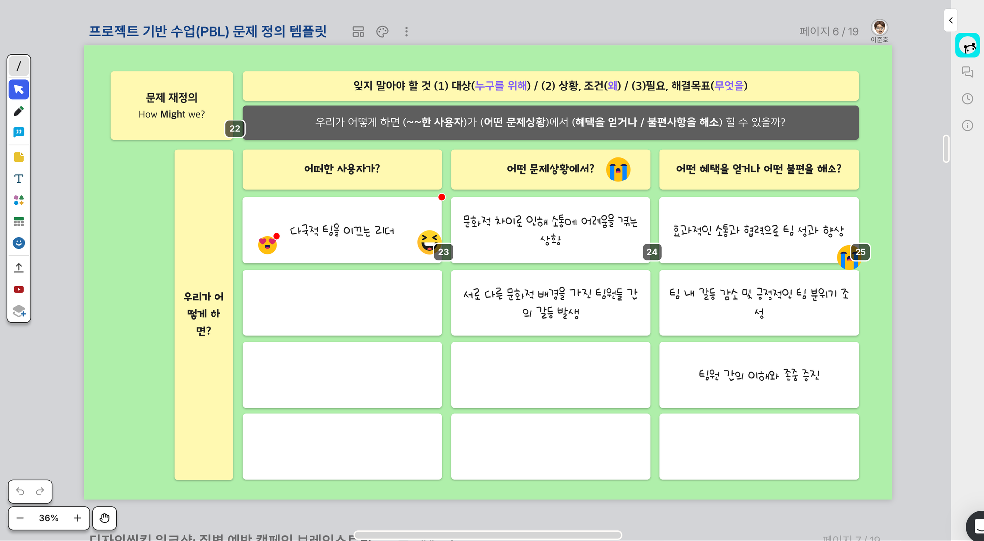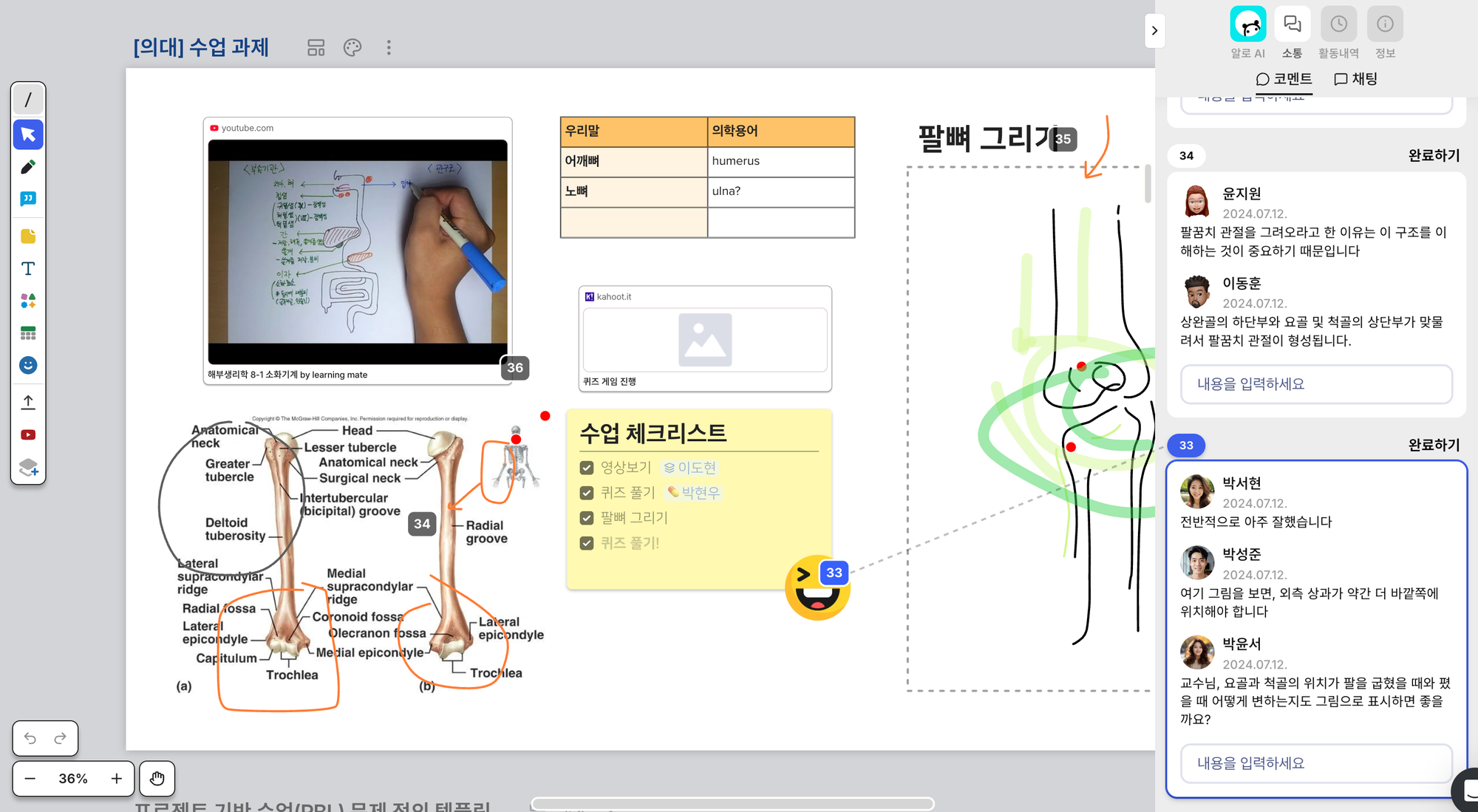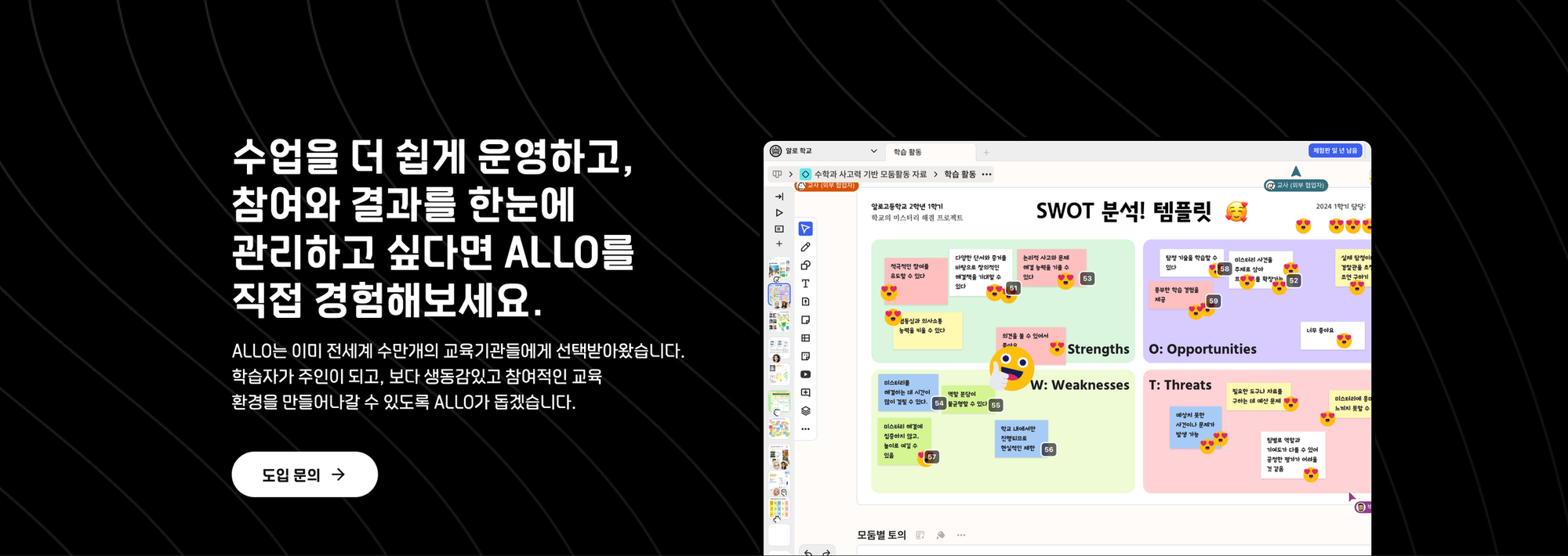 예를 들어 ALLO를 수업에 활용하면, 이전에는 불가능했던 다양한 상호작용 설계가 가능해집니다. 교수자는 강의 중간에 토론 주제를 주고 “ALLO 보드에 각 팀의 아이디어를 10분간 작성하세요”라고 지시한 뒤, 모든 팀의 보드 화면을 동시에 지켜보며 의견 흐름을 파악할 수 있습니다. 그리고 곧바로 뛰어난 아이디어를 소개하거나, 잘못된 방향으로 가는 그룹을 바로잡아주는 즉각적 개입이 가능합니다. 이러한 실시간 모니터링과 피드백은 기존의 구두 질의응답보다 훨씬 효율적이고 포괄적입니다. 또한 ALLO에서는 학생들이 도형, 포스트잇, 이미지 등을 활용해 시각적으로 사고를 전개할 수 있기 때문에, 말로 설명하기 힘든 개념도 쉽게 공유됩니다. 이는 학습의 다각화를 도와 다양한 유형의 학습자가 자기 강점을 살려 참여하도록 유도합니다.